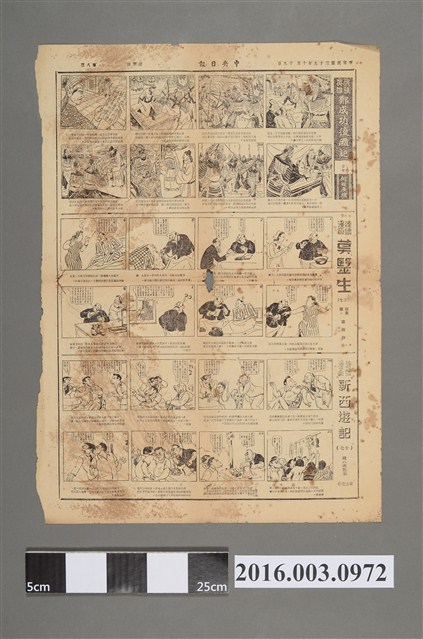 此份文物為1950年10月19日第7版的《中央日報漫畫半週刊》,上方為各個世界新聞人物的漫畫畫像,如中華民國大總統蔣中正、美國總統杜魯門、澳洲總理孟賽斯等,共計31人。下方則是長連載的〈拍案驚奇—閩匪中訃〉。