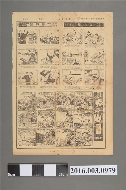 此份文物為1950年11月13日第7版的《中央日報漫畫半週刊》,上方為時事漫畫與時事人物,皆有標題:〈他還能壓得住大陸人民的怒吼嗎?〉、〈紳士:喂!你是不是打眞的〉;下方則是長連載的〈土包子下江南—九路〉。