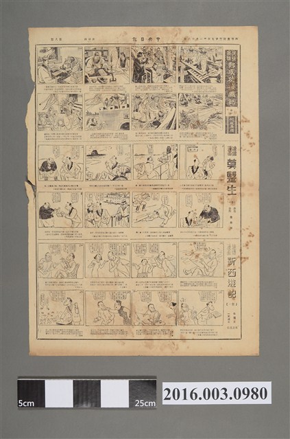 此份文物為1950年11月16日的《中央日報漫畫半週刊》第7版,上方為時事漫畫,皆有標題:〈史達林:「世界只剩我一個人,我才放心,丟掉利刃。」〉、〈你能永保不會失手嗎?〉;下方則是長連載的〈拍案驚奇—三斤米店〉。
