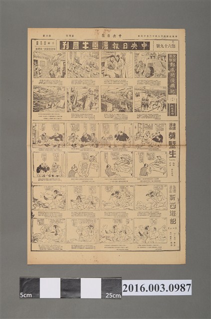 此份文物為1950年12月14日的《中央日報漫畫半週刊》,共有三則漫畫,分別是長連載的〈鄭成功復國記〉、〈莫醫生—配給罪名〉與〈新西遊記—悟○東方過「鐵幕」〉。