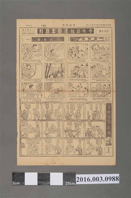 此份文物為1950年12月17日的《中央日報漫畫半週刊》,共有三則漫畫,分別是長連載的〈黃興傳〉、〈花木蘭〉與〈土包子下江南—新邏輯〉。