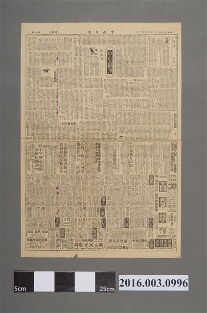 此份文物為1953年6月12日第五版的《中央日報》,內容主要為臺灣各地情勢,如〈南市疏導鹽水溪 整治計畫昨通過〉、〈早稻收刈新穀登場 彰化花蓮米價下跌〉、〈彰雲東投等四縣 增設診斷實驗室〉等。下方占三分之二版面全是當時的電影情報,如〈吉布賽的誘惑〉、〈懷春乳燕〉、〈美男子〉等。