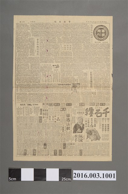 《中央日報》為國民黨的機關報,是國民黨最具代表之媒體,1988報禁開放之前,台灣的報紙受到「限張」、「限證」、「限印」三種限制,而被准許發行報紙的,主要媒體以黨、公營的《中央日報》、《中華日報》、《台灣新生報》、《青年日報》等為主。而解除戒嚴、開放黨禁後,過去因國民黨支撐而存在的《中央日報》,在自由市場下顯得不堪一擊,也被迫採取一連串措施,如使其自給自足等。《中央日報》因為代表國民黨黨報,因此作風嚴謹,不採「腥羶色」手法,堅決避免渲染或違背主義。此份文物為1953年7月5日第五版的《中央日報》,內容主要為