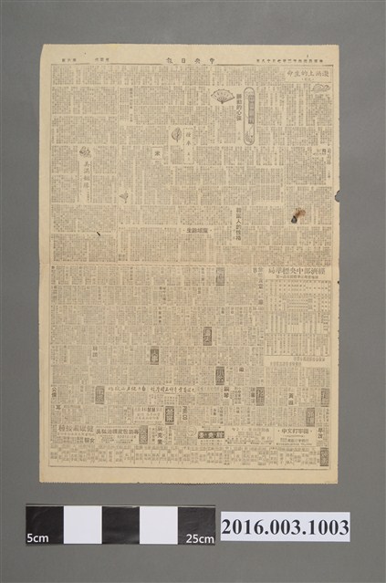 《中央日報》為國民黨的機關報,是國民黨最具代表之媒體,1988報禁開放之前,台灣的報紙受到「限張」、「限證」、「限印」三種限制,而被准許發行報紙的,主要媒體以黨、公營的《中央日報》、《中華日報》、《台灣新生報》、《青年日報》等為主。而解除戒嚴、開放黨禁後,過去因國民黨支撐而存在的《中央日報》,在自由市場下顯得不堪一擊,也被迫採取一連串措施,如使其自給自足等。《中央日報》因為代表國民黨黨報,因此作風嚴謹,不採「腥羶色」手法,堅決避免渲染或違背主義。此份文物為1953年7月18日第五版的《中央日報》,內容主要