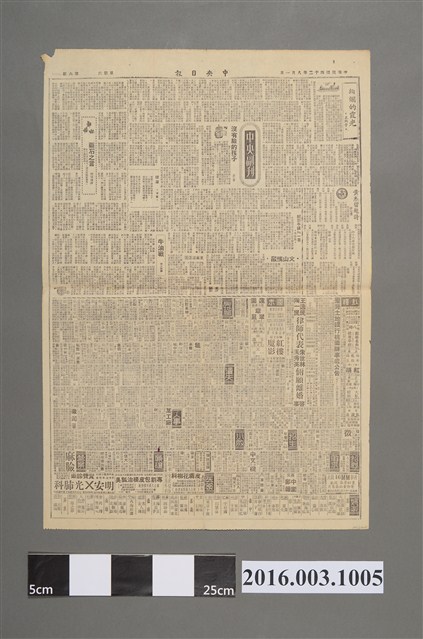 此份文物為1953年8月1日第五版的《中央日報》,內容主要為台灣各地情勢,如〈臺中縣二議員 被控違法選舉〉、〈澎湖島漁民 最先居何處〉、〈私運糧食走私案 臺中地院已宣判〉等。下方還有娛樂廣告,也能看出日治時期產物之延續,如藝妓、哥倫比亞(日治時期的唱片行)等資訊。
