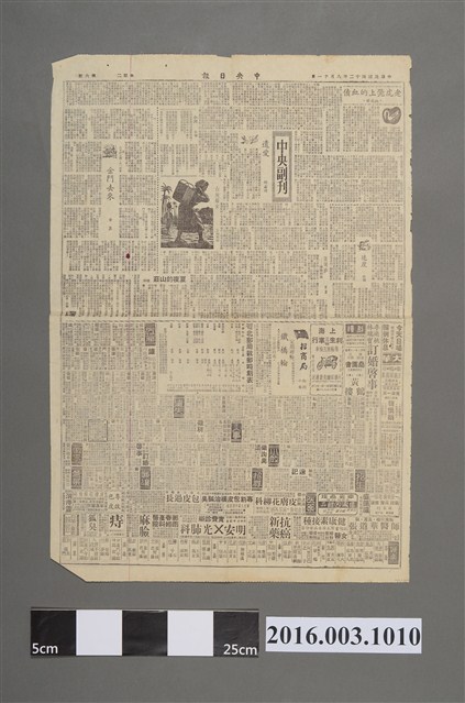 此份文物屬於民國42年8月11日第五、六版的「中央副刊」,內容即以能打動人心的文章如〈夏夜的山莊〉等為主,其下還附有當時的租房資訊、徵人啟事與疾病廣告,另外最下一行,另分「娛樂」一類,從這些資訊可看出當時社會關注的重心與流行的趨勢。