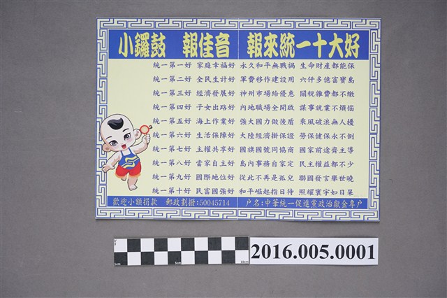 本件文物為2016年第9屆全國不分區及僑居國外國民立委選舉,第8號中華統一促進黨政黨票選舉文宣,為中華民國的一個強烈主張中國統一的統派政黨。正面右方為黨主席白狼 張安樂懇請支持,左方說明政黨政見,文宣背面則宣傳台灣與中國統一後的十大好處,最下方則為小額捐款的政治獻金專戶帳號。