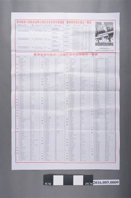 本件文物為2014年臺灣省雲林縣17屆縣長選舉選舉公報,由雲林縣選舉委員會編印,採雙面印刷,1張2頁,提供候選人簡介、政見、投票時間、方法、注意事項、反賄選、政見發表的時間與投(開)票所的資訊。