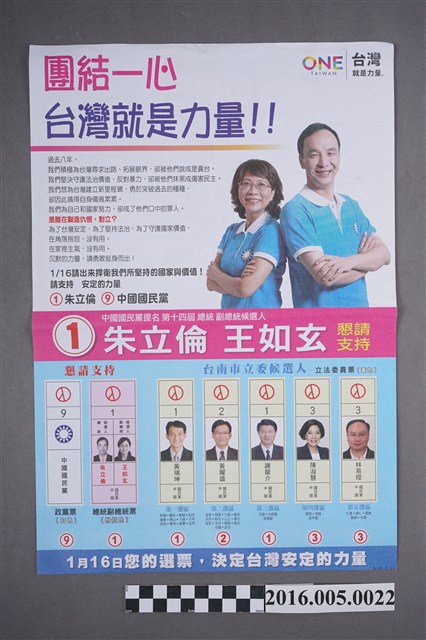本件文物為2016年正副總統暨立委選舉,臺南市國民黨正副總統、立委選舉參選人人宣傳單。2016年第九屆立法委員選舉與第十四任總統、副總統選舉合併舉行,立委選舉單一選區兩票制,一票投各區立委,一票選政黨決定立法院不分區立委之席次,三合一的選舉方式,體現在選舉文宣的製作,正面上半部為主視覺設計「ONE TAIWAN 」與其欲推動的政見,下方比較對手民進黨總統候選人蔡英文與國民黨參選人朱立倫的政見,背面列出國民黨政黨選票、正副總統、台南市各選區立委參選人之參選號,懇請選民一同支持。