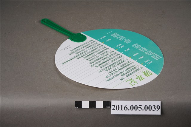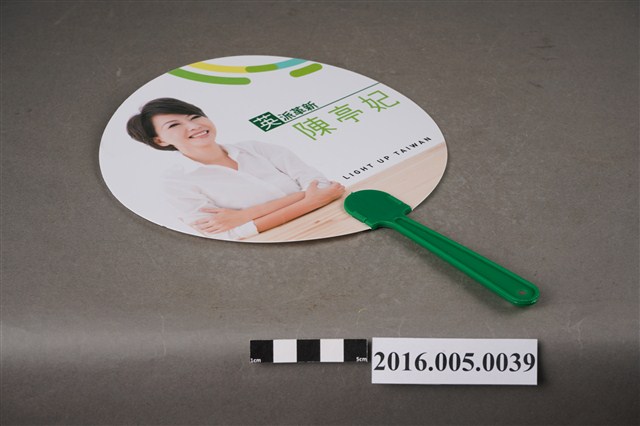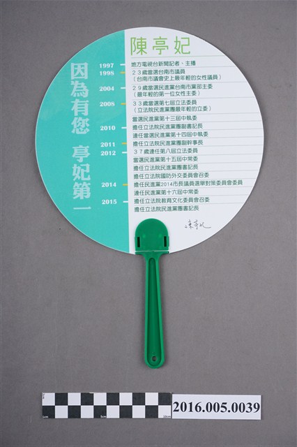 該物件為國立臺灣歷史博物館研究組組長謝仕淵所捐贈之2016年總統大選民進黨立委候選人陳亭妃宣傳扇。該宣傳扇屬於選舉贈品,前後兩面印有「英派格新 陳亭妃」、「因為有您 亭妃第一」等字樣,以及候選人的半身照與經歷,整體設計以民進黨的代表色系為主。