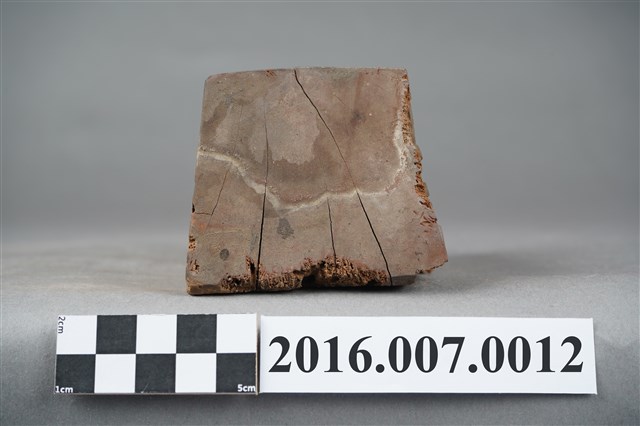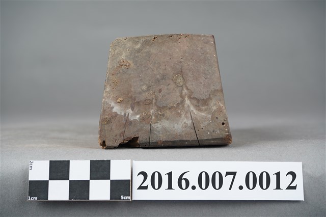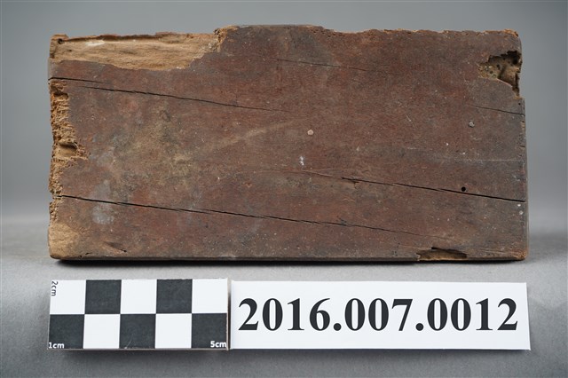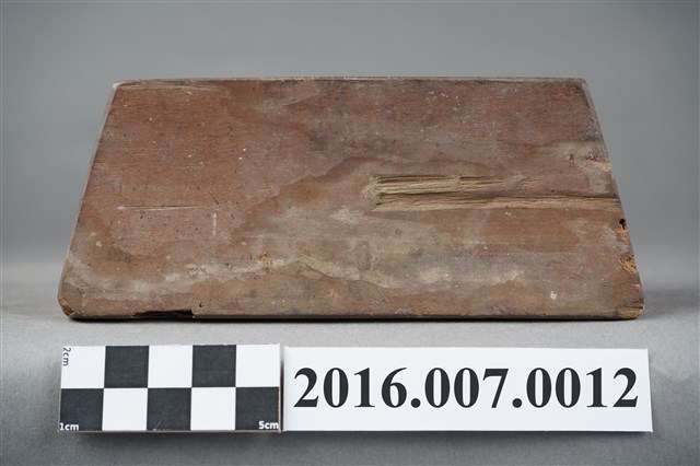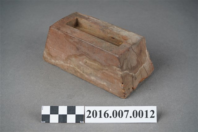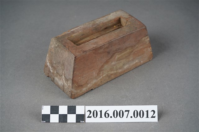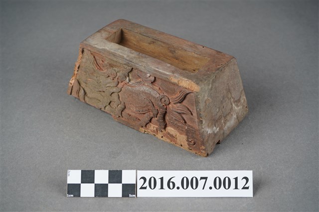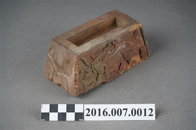 1.本件木雕神主牌底座,做上窄、下寬的梯型形式,正面淺浮雕麒麟,頭朝後看,其餘三面未雕,中央有一凹槽,作為置放神位木牌使用。表面上有紅漆,底部有蛀損情形。本件為常見的神主牌底座形式。