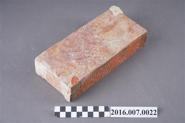 1.本件燕尾磚,尺寸為21.7X10X4.5公分,屬條磚,原位於善化陳宅第二落小邊牆面,於104年12月3日取得,周圍留有接縫的些許灰泥,一面邊緣有敲損痕跡。燕尾磚,又稱為顏只磚、燕子磚、雁子磚、岸只磚,長側面有1-2道黑色斜紋為其特徵,是入窯磚坯交錯疊放與松木等燃料灰的油脂留在磚面上所形成。因交錯疊放的斜紋形似燕尾而稱之,質地細緻而精美,通常使用於傳統民居明顯部位牆面。