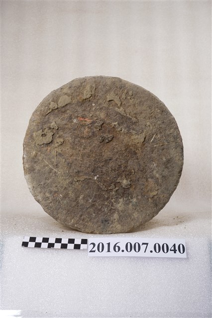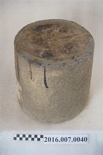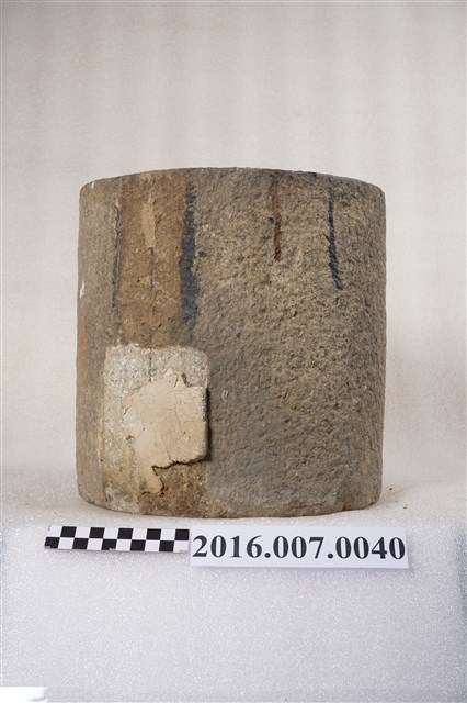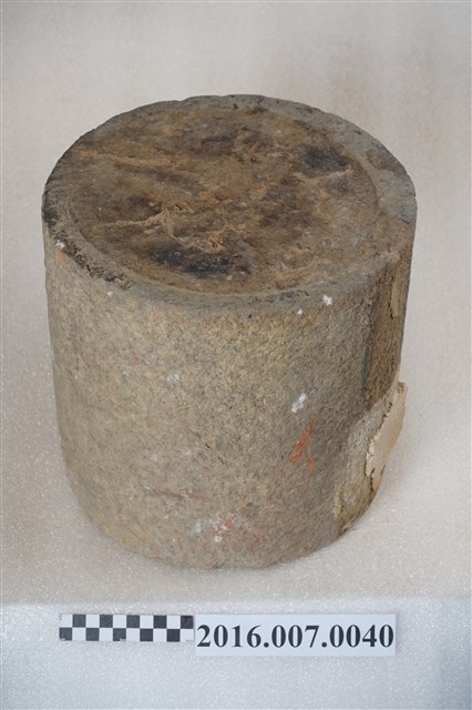 1.本件柱珠,花崗岩製,直徑26公分、高26公分,用於善化陳宅第二落明間中柱(脊柱、將軍柱),直徑較大,與下一件(105008-0041)為一對,為明間最主要的柱子柱珠,於104年12月3日取得。柱珠,是柱子的基礎,防止地面的潮氣使木柱受潮腐爛。本件中柱柱珠為圓柱形,無雕飾,頂部平整,屬簡單作法,周圍有與木隔斷牆相接的黑線記錄與痕跡,表面留有局部灰泥。其直徑與上方木柱相同,又被稱為竹節柱。