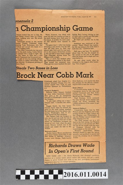該物件為捐贈者林義雄先生於1977年赴美參加第三十一屆威廉波特少棒賽時,在當地所取得的報紙。這份報紙名為"The Williamsport Sun-Gazette",是美國賓夕法尼亞州(Pennsylvania)威廉波特市自1801年開始發行的當地早報。這份早報為美國現今仍持續發行的古老報紙之一。