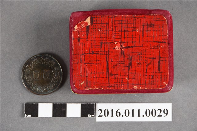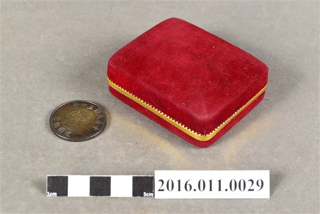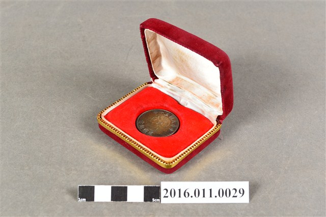 硬幣置於大紅色的絨布上,裝在包覆著暗紅色絨布的盒中。