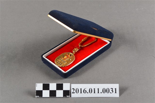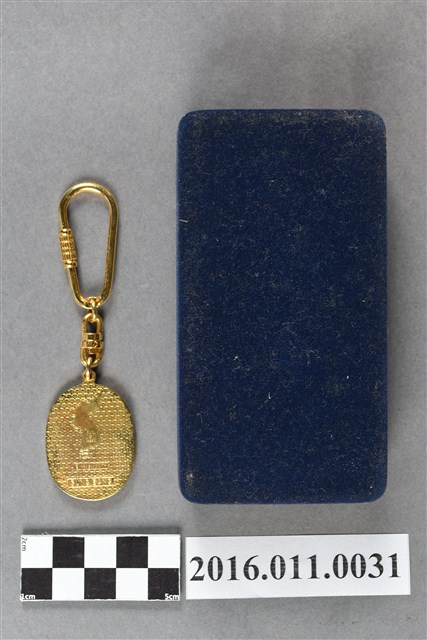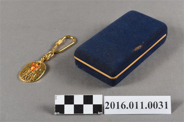 1. 本件1988年漢城奧運紀念鑰匙圈及收藏盒,由林義雄先生捐贈給臺灣歷史博物館,包含:絨布盒及24K金鑰匙圈,共兩件。外盒呈長方形,以藍色絨布包裹,蓋沿鑲有金邊。鑰匙圈由24K金打造,吊牌呈橢圓形,正面圖樣為此屆奧運吉祥物「小虎仔」(Hodori),與黑色「SEOUL」、「1988」字樣,背面刻有南韓地圖、國旗、國名等紋樣,上接D型扣環鑰匙圈,開口為螺旋扣,以旋轉方式開關。