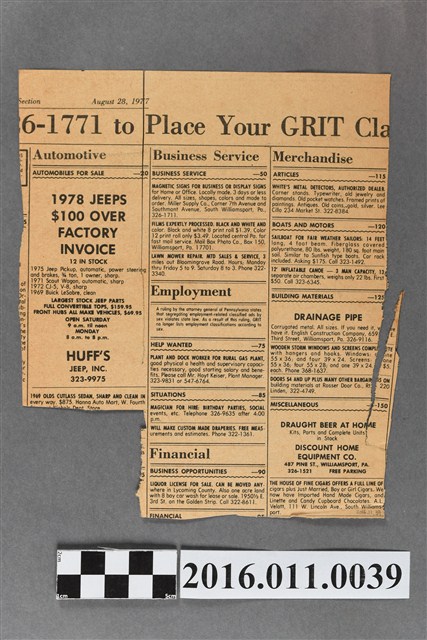 該物件為捐贈者林義雄先生於1977年赴美參加第三十一屆威廉波特少棒賽時,在當地取得的報紙。這份報紙名為GRIT,1882年由德裔美國人Dietrick Lamade在美國賓夕法尼亞州的威廉波特所辦。當時Dietrick Lamade為Daily Sun and Banner報社的廣告打字員,而GRIT只是該報上的「週六版」,由Dietrick Lamade負責。1884年Dietrick Lamade離開原本的報社,GRIT獨立發行。