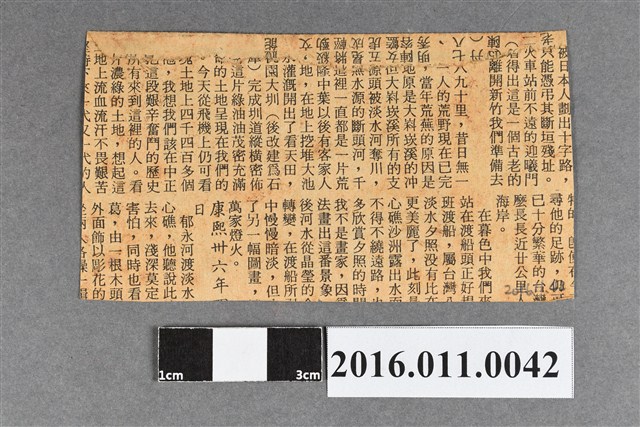 該物件為捐贈者林義雄先生初中時參加中、日青少棒友誼賽的報導。由於報紙被裁剪下來,無法確認是由何家報社報導。 報紙上左方有一張照片,右方的說明文字為:中、日青少棒友誼賽,昨日華興對調布之役,六局下半,華興林義雄被刺殺於三壘前的剎那。