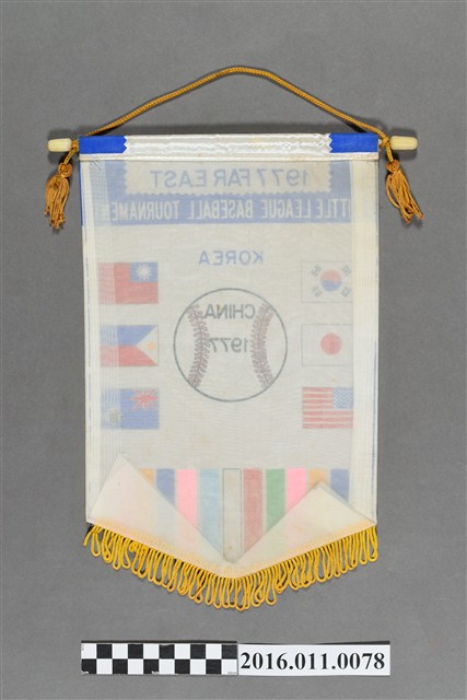 該物件為1977年世界少棒遠東區選拔賽球員出賽前,南韓隊致贈之紀念旗。旗幟最上方以白底藍字印上「1977 FAR EAST」,下方依序有藍底白字的「LITTLE LEAGUE BASEBALL TOURNAMENT」,以及白底藍字的「KOREA」。旗幟兩旁有六面國旗,右方由上至下分別是中華民國、菲律賓、香港,左方由上至下則代表南韓、日本、關島(關島為美國位於西太平洋上的領土,故紀念旗上印著美國國旗)。在兩排的國旗中間有一顆棒球,球上印有CHINA和1977,代表當年遠東區賽事的主辦國(比賽地點)和時間。