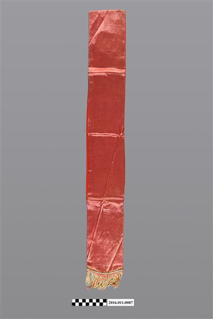 該物件為捐贈者林義雄先生於1977年赴美參加第三十一屆威廉波特少棒賽奪冠後,回台於高雄遊行時所披帶的紅帶。紅帶上有黃色字樣:國手 林義雄。該物件出現在林義雄先生回台後所拍攝的許多照片中。編號85的物件與該物件相似,惟姓名前所寫的頭銜不一樣。