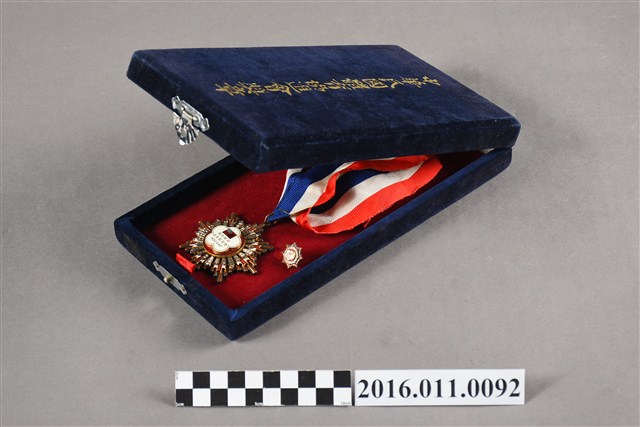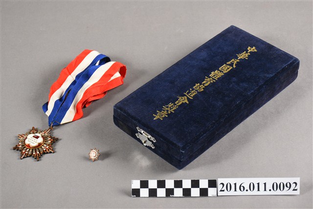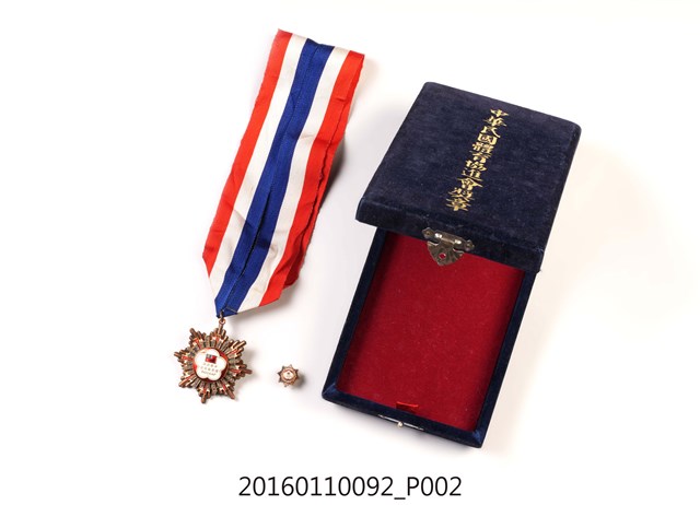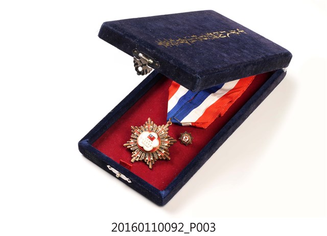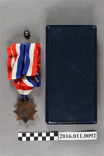 該物件是中華民國體育協進會頒發給捐贈者林義雄先生的獎章與胸章,二者均置於藍色絨布盒中。獎章呈現四射八方的星形造型,中央以白色梅花為底,襯出中華民國國旗與「中華民國體育協進會ROCAAF」之字樣,造型立體精美。背面以篆書刻寫:「三X 體協獎章 NO. 069」。胸章為獎章的縮小版,設計均與獎章一樣。