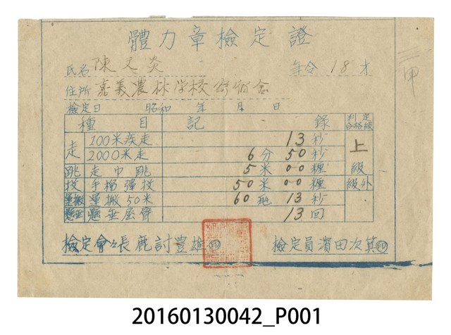 本件文物為陳文炎先生於18歲在嘉農就學時,體力獎章的檢定證,正面包括基本資料、測驗的項目與成績,檢定的結果:上級。從文物的右上角寫著「三甲」二字,對照陳文炎的成績單可知「三甲」是陳文炎三年級(昭和17年)的班級。可推測應為1942年(昭和17年)所得到的檢定證。據陳文炎先生口述:「自己最感到光榮的一次是通過體育獎章的檢定,掛著獎牌去踩街。那時候的體育獎章分為初中上三級,全嘉義市中等學校只有五人拿到上級,農校有三人拿到,二人是五年級,只有我是三年級...很可惜的那塊檢定獎牌後來不見了。」可知此件文物是讓陳文炎先生念念不忘人生光榮的時刻之一,除了檢定證外,還有檢定的獎牌,只可惜獎牌已不見,只剩下這張檢定證保留下來,成為過去的光榮時刻的證明。