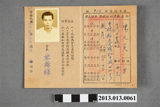 本件文物為1963年(民國52年),臺灣省體育會柔道協會會員證,會員:陳文炎。文物背面左側為核發日期、注意事項、陳文炎大頭照,右側則為個人基本資料、柔道的段位:三段。