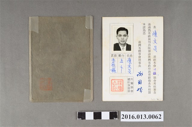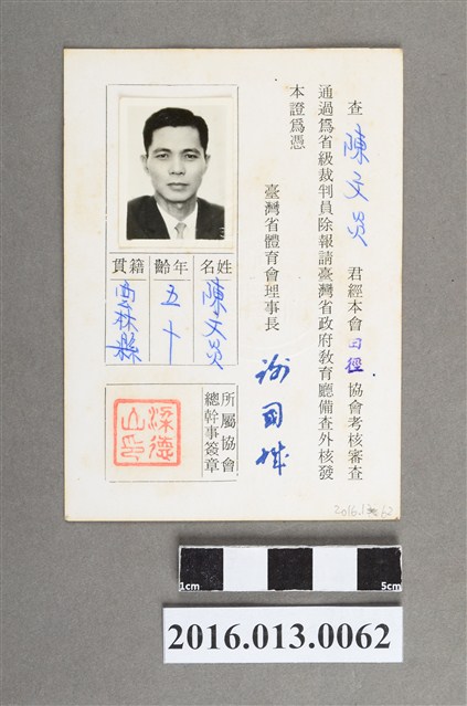 本件文物為1975年(民國64年),臺灣省體育會審核通過陳文炎可擔任省級田徑賽事之裁判證,正面為此裁判證的權限與裁判的項目:田徑「凡全省性該項錦標賽及省籍運動會該項比賽必須持有本證之裁判擔任始認為合法比賽。」背面則為大頭照、基本資料與所屬協會總幹事蓋章。