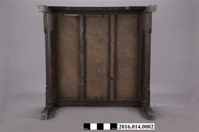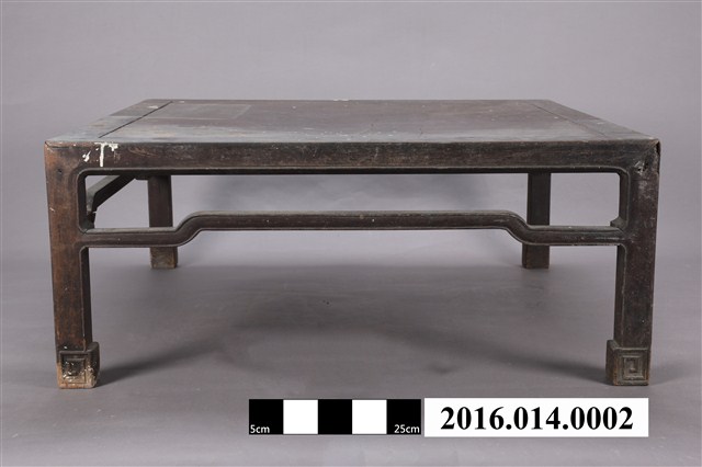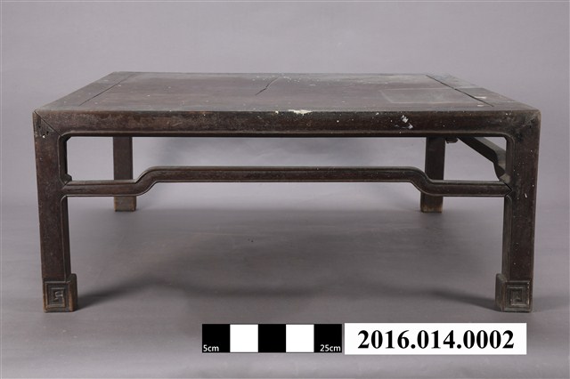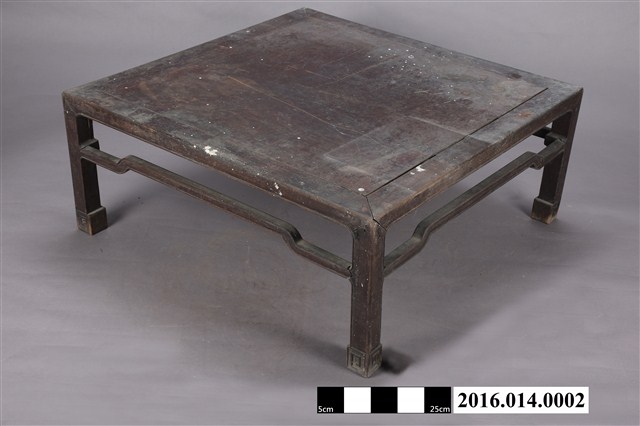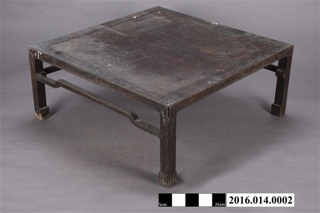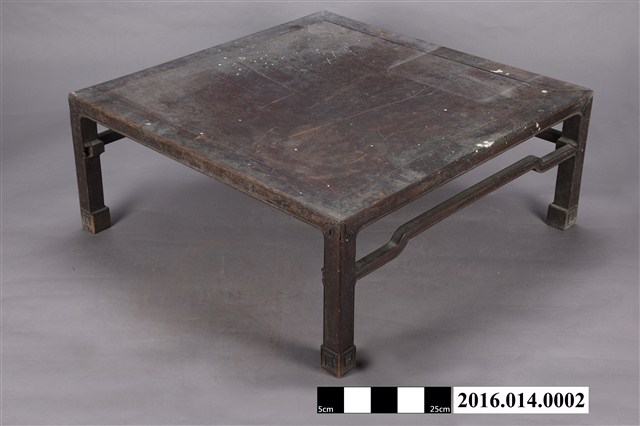 根據捐贈者表示,本件為父母親戰後遷台購置之日式平房內前日本屋主所留下的客廳矮桌,桌面呈正方形,長、寬各為82cm,高34cm,以實木榫接製作而成,表面施以紅褐色漆,無雕花裝飾。捐贈者父母因覺得日人留下的家具十分完好,因此繼續使用。早年此矮桌放在屋子後方的起居室使用,室內另有風琴、大鏡子,此桌是放置在角落,常常拿來下棋用。方桌保存狀況大致良好,無發現蟲菌現象。
