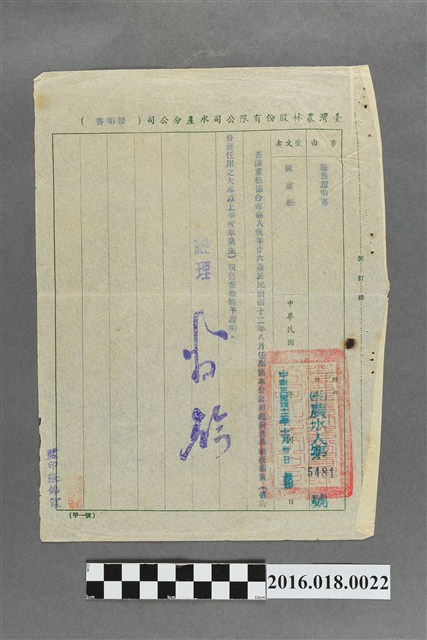 陳重松臺灣農林股份有限公司水產分公司服務證明書