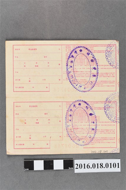 基本發行張數為六十萬張,橫式設計,由右至左,聯數為圓框上飾花框蝴蝶花葉紋,「中華民國伍拾陸年拾壹月貳拾伍日開獎」,「愛國獎券」,「第465期」,「臺灣省政府委託臺灣銀行發行」,下列編號「B517919」,底飾愛國獎券浮水印,「新臺幣伍圓」。 甲、乙聯一同購買,編號分別為A601714、B601714。背面蓋有勝發獎券行、嘉義市民生路204號。