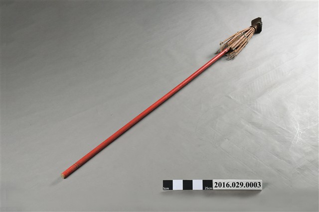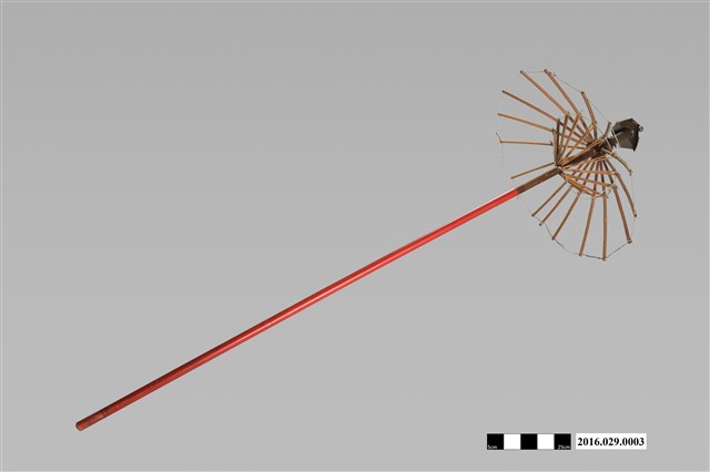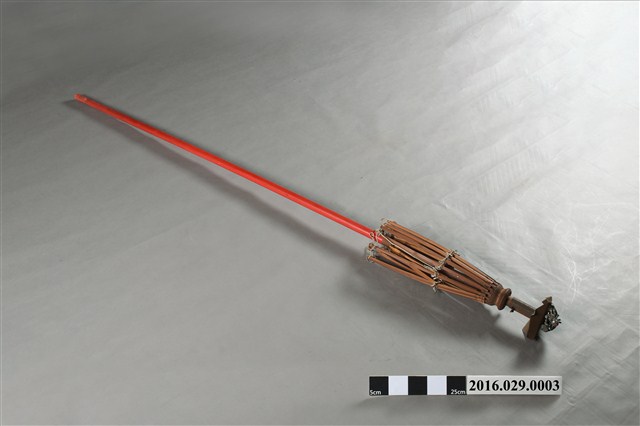 2.涼傘,俗稱「娘傘」,造型為圓筒狀,需以涼傘骨支撐,才能張傘,一般傘頂上飾有葫蘆、鳳凰等裝飾。本件為竹製涼傘骨,高約8尺長,傘頂飾有鐵製裝飾,但受損難以辨識。據廟方指出約使用60年左右。現今傘骨材料多改以白鐵為多,部分也有使用塑鋼材料。