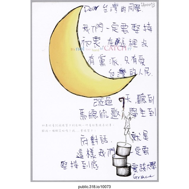1.內容:Dear台灣的同學:我們一定要堅持初衷,在這裡沒有黨派,只有愛台灣的人民,已經過7天,聽到馬總統邀學生到府對話,就是這樣我們一定要堅持到底2.中研院原件典藏編碼:IA000733.中研院識別號:100734.中研院關係藏品-關聯:5.中研院關係藏品-整體:6.提供者: