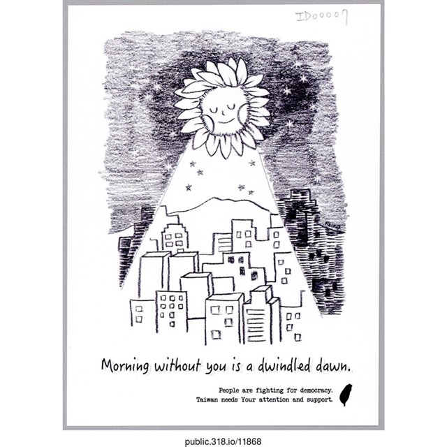 1.內容:在台北的朋友們加油!!!做自已認為對的事情,你們並沒有錯!!!\r\n謝謝你們讓這原本令人失望的世界增添了一絲的陽光也多了一點美好\r\n太陽花加油\r\n捍衛民主,反對黑箱。2.中研院原件典藏編碼:ID000073.中研院識別號:118684.中研院關係藏品-關聯:5.中研院關係藏品-整體:6.提供者: