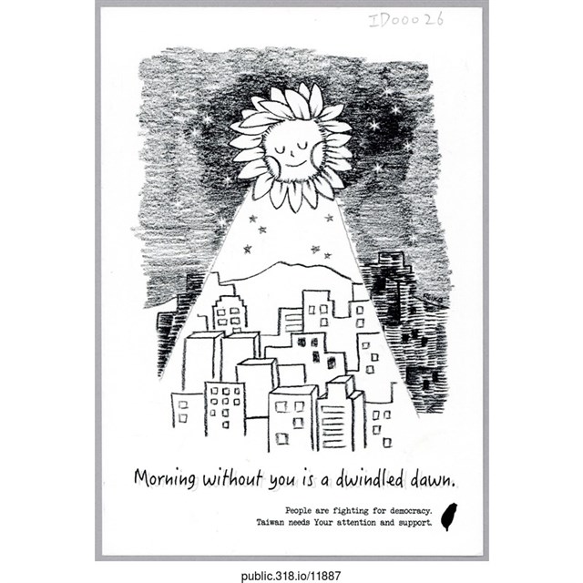 1.內容:服貿雙帥加油!太陽花們加油!Taiwan民主有你們真好,你們都是台灣民主的Big Hero Thanks a lot2.中研院原件典藏編碼:ID000263.中研院識別號:118874.中研院關係藏品-關聯:5.中研院關係藏品-整體:6.提供者: