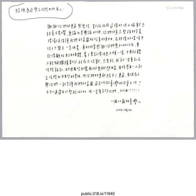 1.內容:給陳為廷與立法院內所有人:謝謝你特的勇氣與堅持,對抗政府這樣的洪水猛獸也絲亳不畏懼,無論外界輿論如何,你們仍意志堅強的守著,捍衛及保護我們的家園所珍貴的事物,在那樣的環境中待了十幾天一定很累,真的非常感謝你們無私的付出,要記得顧好自已的身體,累了要記得休息大睡一場,才有好體力能夠繼續對付政府大怪獸,只要能,我就一定會到立法院報到,即使風吹日曬雨淋無聊想回家,有時隻身一人到立法院外也有些害怕,但你們的勇敢給予了勇氣,有很多人與你們一起守護我們的家園,這片叫做台灣的可愛土地!不知道還有什麼能做的,但一定會支持你們,加油!!!!!!\r\n一個23歲的台灣人2.中研院原件典藏編碼:IF000043.中研院識別號:119404.中研院關係藏品-關聯:5.中研院關係藏品-整體:6.提供者: