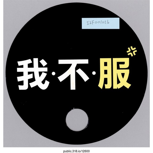 1.內容:退回服貿捍衛民主\r\n我不服2.中研院原件典藏編碼:I2F001053.中研院識別號:126004.中研院關係藏品-關聯:5.中研院關係藏品-整體:6.提供者: