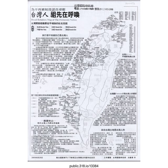 1.內容:控訴中國消滅台灣祖\r\n台灣人祖先在呼喚」2.中研院原件典藏編碼:OG000673.中研院識別號:133844.中研院關係藏品-關聯:5.中研院關係藏品-整體:6.提供者: