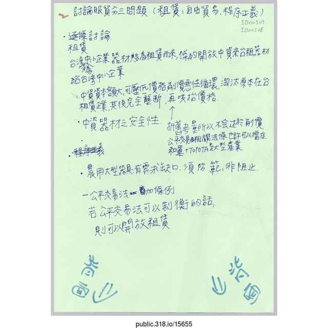 1.內容:討論服貿分三問題(租賃、自由貿易、程序正義)\r\n˙租賃討論 台灣多為中小企業器材多為租賃而來,條約開放中資來台租器材給台灣中小企業 ˙中資資本額較大,可壓低價格,削價惡性循環,淘汰原本在台租賃企業,其後完全壟斷,再哄抬價格←折舊考量所以不會過於削價,公平交易相關法條也許可以擋住,和運+TOYATA是大型產業 ˙中資器材之安全性 ˙農用大型器具,有需求缺口,須防範,非阻止 -公平交易法加條例 若公平交易法可以制衡的話則名以開放租賃 則可以開放租賃\r\n˙程序正義 要與公民討論 這次不開