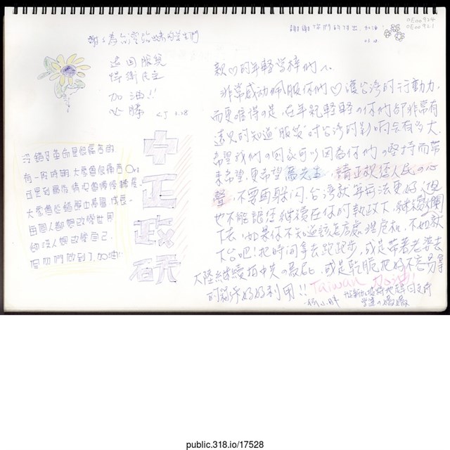 1.內容:謝謝為台灣站出來的學生們\r\n退回服貿 捍衛民主\r\n加油!!必勝\r\n沒錯!革命是很痛苦的\r\n有一段時期大家會很痛苦Orz\r\n可是到最後,情況會慢慢轉變\r\n大家會從錯誤中學習、成長\r\n每個人都想改變世界\r\n卻沒人想改變自己,但你們做到了,加油!!\r\n謝謝你們的付出,加油!\r\n親愛的年輕學子們~\r\n非常感動佩服你們愛護台灣的行動力,\r\n而更難得的是,在年紀輕輕的你們卻非常有遠見的知道"服貿"對台灣的影響會有多大\r\n希望我們的國家可以因為你們的堅持而帶來希望\r\n更希望馬先生,請正視您人民的心聲,\r\n不要再躲閃,台灣就算無法更好!\r\n但也不能讓您繼續在你的執政下,繼續爛下去,\r\n如果你不知道該怎麼處理危機,不如就下台吧!\r\n把時間拿去跑跑步,或是帶著老婆去大陸繼續拍中共的馬屁,\r\n或是乾脆把好不容易拿到的綠卡好好利用!!\r\n知識份子就該承擔更多的「社會責任」。這是一位經濟學老師告訴我的。\r\n所以我站出來\r\nTo靜坐的大家\r\n感謝勇敢的你們,在此和平的抗爭\r\n為臺灣的民主邁進一大步!\r\n大家加油!台灣加油!\r\n在這裡的大家辛苦了\r\n大家都是為了讓台灣更好\r\n台灣人的善良\r\n不該被糟蹋\r\n不該被欺壓\r\n台灣人加油\r\n鍵盤小妹走出來\r\n守護台灣民主\r\n我們加油 !台灣加油!\r\n對不起做不了更多\r\n至少還能在外面守著我們認為的善\r\n加油!休想台灣人民妥協!\r\nKeep the Faith!!!\r\n感謝所有參與這次活動的人\r\n因為你們台灣會更好!2.中研院原件典藏編碼:OE009243.中研院識別號:175284.中研院關係藏品-關聯:5.中研院關係藏品-整體:6.提供者:高格孚