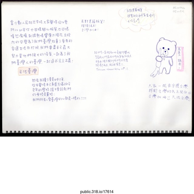 1.內容:國家為榮總統為恥......台灣不服貿2.中研院原件典藏編碼:OE009423.中研院識別號:176144.中研院關係藏品-關聯:5.中研院關係藏品-整體:6.提供者:高格孚