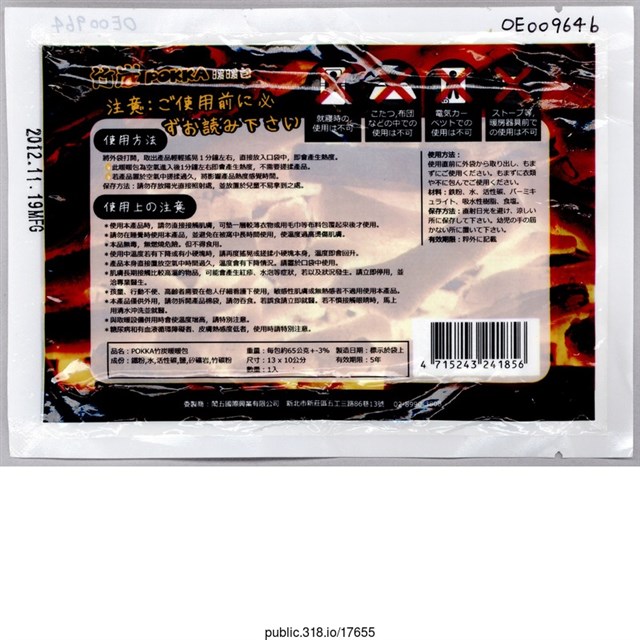 1.內容:POKKA竹炭暖暖包2.中研院原件典藏編碼:OE009643.中研院識別號:176554.中研院關係藏品-關聯:5.中研院關係藏品-整體:6.提供者:高格孚