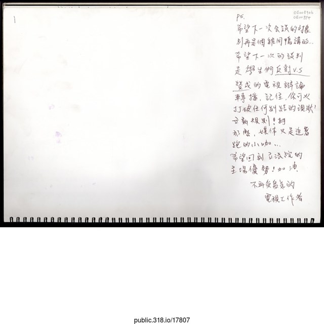 1.內容:給在立院的各位夥伴們:\r\n我相信大家在這為了台灣站出來在這是有意義的,\r\n政府如此作為讓大家從教室走出來,\r\n來到了這個我們民主的講堂,\r\n許多人在這都都得到許多的感動,\r\n我們只要堅持下去\r\n這個世界一定會因此而改變,大家加油!!\r\n當政府的黑暗照在我們的天空,\r\n我們就必須點亮台灣的燈火,\r\n這個世界依然不停地轉動,\r\n而我們必須使國家跟上這節奏,\r\n今日的你和我,即便是不起眼的小苗火,\r\n也要用希望燃起我們的天空!\r\n各位年輕朋友們:\r\n有你們真好,台灣因你們才沒有沉淪下去,\r\n台灣的希望寄託在你們身上\r\n你們創造了台灣歷史,實在英雄出少年,\r\n台灣有你們真好,你們可是傲視世界之外,\r\n你們的表現絕對不輸國外的茉莉花革命,加油!加油\r\n希望你們繼續堅持,我們一定會是你們堅定的後盾,\r\n我們一起合作\r\n為臺灣努力打拼,我愛你們,\r\n我愛台灣,台灣一直發光發亮\r\n同學們:大人們要孩子接受這混亂世界,小孩不從 只好將它打破…\r\n大人分贓不均這世界的金錢資源\r\n小孩只好將它打破…\r\n商人們強將黑心食品送進孩子口中,\r\n孩子只好將它打破…\r\n最後…立法院也被打破了…\r\n太多人因為你們終於歡喜地進入這個公民街頭殿堂…\r\n你們真的很有勇氣!\r\n因為在你們的臉上,我還看到你心中的「善」與「責任」~\r\n在大陸的教育下 顯現不出的「善」可以在台灣開花、結果\r\n他們多麼的嫉妒你們啊,\r\n因為這樣的學運,不可能在大陸、香港等地發生…\r\n大破大立「善」碎碎平安\r\nps.希望下一次會談的對象\r\n別再是個雞同鴨講的…希望下一次的談判\r\n是學生們反對v.s贊成的電視辯論轉播\r\n記住,你可以打破任何糾結的現狀\r\n立新規則!\r\n那麼,媒體只是追著跑的小咖…\r\n希望回到立法院的主場優勢!加油2.中研院原件典藏編碼:OE008903.中研院識別號:178074.中研院關係藏品-關聯:182715.中研院關係藏品-整體:6.提供者:高格孚