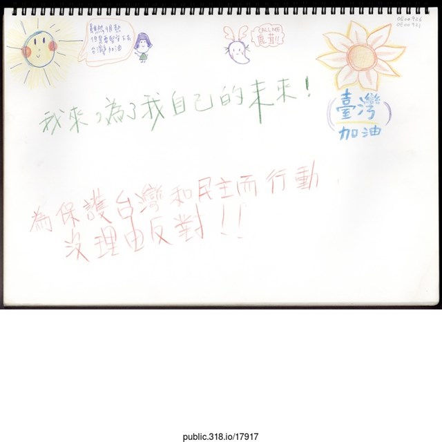 1.內容:我來,為了我自己的未來!\r\n為保護台灣和民主而行動\r\n沒理由反對!!2.中研院原件典藏編碼:OE009263.中研院識別號:179174.中研院關係藏品-關聯:5.中研院關係藏品-整體:6.提供者:高格孚