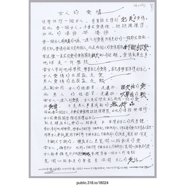 1.內容:女人的愛情\r\n沒有任何一個女人,有資格去得到“完美”的愛情。\r\n因此每一個女人,才會在愛情裡,跌跌撞撞得,\r\n如此的淒慘與淒慘。\r\n每一個女人都天真的以為,一進入到愛情,所有美好的一切都在裡面。\r\n殊不知,愛情的組合是兩個人,而這兩個人的愛情關係會不斷的改變。\r\n當這種一直在改變的愛情關係,拉大兩人的距離,愛情就會出事。\r\n地球是一所學校。\r\n當女人來到地球學校,學習自己的愛情,首先要學習保護好自己。\r\n女人愛情的出發點是愛。\r\n南人愛情的出發點是戰。\r\n這就如同女人的性器官,是屬於,接受性的愛。\r\n而男人的性器官,是屬於,攻擊性的戰。\r\n當女人一進入愛情,女人是再付出自己所有一切的愛。\r\n但愛情,只是男人事業成就的裝飾品。\r\n因此每一個女人,才會在愛情裡跌跌撞撞得,\r\n如此的淒慘與淒慘。\r\n女人在愛情關係裡的保護好自己\r\n就是擴張自己,愛的心胸氣度和保護好自己的肉身體。\r\n當女人來到地球學校,學會以不偏不倚不偏袒自己不偏袒別人公平正義的愛向外來為人處世。\r\n那麼女人會從,運用不偏不倚不偏私自己不偏袒別人的強度,廣度與深度\r\n不斷又不斷的,擴張自己更寬闊心胸氣度的愛\r\n當女人,擁有多少比例,不偏不倚不偏私自己不偏袒別人寬闊心胸氣度的愛。\r\n女人就會擁有,多少比例的籌碼,來獲得每一個女人所渴盼,\r\n寬闊心胸氣度的愛情來滋潤自己的愛情。\r\n充滿戰鬥氣息的台灣\r\n臺灣人的臉,有全世界找不到的戰鬥氣息。\r\n臺北是一座歷經兩極對立,在峭壁絕谷,生與死的最後一刻,\r\n所逼迫出來,結晶又結晶的超級大鑽石。\r\n臺北的機車族,是全世界最兇悍的奇蹟。\r\n也是臺灣的商品在全世界,是最兇悍的奇蹟之所在。\r\n臺北的機車族,像箭一般,風馳雷電,於大街小巷,\r\n充滿一股不服輸,頑強的戰鬥力,這是臺北人的個性。\r\n生於憂患死於安樂。\r\n幾十年來,臺灣和中國兩軍對峙。\r\n造就臺灣人,分分秒秒不服輸,頑強的戰鬥意志。\r\n金門和馬祖,是臺灣的兩座寬。\r\n幾十年來一波又一波,臺灣的志願役和義務役士兵,\r\n歷經金門和馬祖,當兵的大洗禮。\r\n讓一批又一批從金門和馬祖,索退伍下來的軍士官,\r\n從金門和馬祖,帶回一批又一批,充滿永不服輸頑強的戰鬥意志。\r\n整體的臺灣島,都充滿了,臺灣軍魂的大頑強。\r\n這也是臺灣人和臺灣的商品,在全世界\r\n都擁有一股,來自台灣國魂,對國家的愛,頑強的戰鬥氣息。2.中研院原件典藏編碼:OE008333.中研院識別號:180244.中研院關係藏品-關聯:5.中研院關係藏品-整體:6.提供者:
