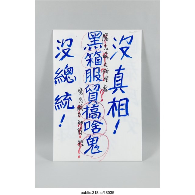 1.內容:沒真相!黑箱服貿搞啥鬼,,,沒總統!全民拒馬\r\n抗議中國惡靈復辟\r\n國泰民安2.中研院原件典藏編碼:OE006653.中研院識別號:180354.中研院關係藏品-關聯:5.中研院關係藏品-整體:6.提供者: