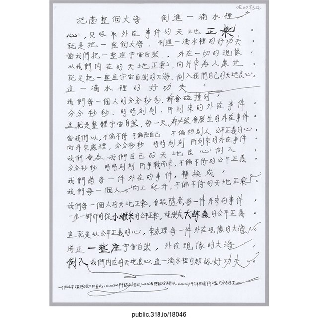 1.內容:凡塵俗世才是更高一層的修道院\r\n當我們誕生在凡塵俗世,身處凡塵俗世,\r\n我們需要物質的生活,我們才足以安身立命在凡塵俗世。\r\n當我們不偏不倚 不偏袒自己 不偏袒別人 公平正義的心,\r\n向外來大力爭戰,我們自己心安理得的,私人物質慾望。\r\n就是靈魂出汙泥而不染的超級大修為。\r\n我們所大力爭戰而來的物質,都是符合天道的物質。\r\n因此,我們內在的靈魂,會在向外大力爭戰物質,\r\n的天大過程,一步一腳印的出汙泥而不染。\r\n我們同時豐富了,人類所渴盼,出汙泥而不染的物質和\r\n出汙泥而不染的靈魂,兩者所結合在一起自然之道的神。\r\n也唯有,出汙泥而不染的物質和出汙泥而不染的靈魂,\r\n陰與陽兩者,結合在一體,才會擁有自然之道的神。\r\n當人們歷經凡塵俗世的打擊、折磨、創傷和痛徹心扉的絕望,\r\n而下定大決心,向外來追逐神性和天堂樂園。\r\n因此,排斥金錢,放棄物質,拒絕競爭,遠離爭鬥,\r\n放棄家庭生活,拋妻棄子,遠離社群,拒絕所有一切的苦痛,\r\n住深山,住在修道院\r\n這都只是,排斥金錢物質的神性沉迷者,神性迷戀者,\r\n神性追逐者,在追求他自己的私心,所渴盼的大解脫而已。\r\n凡塵俗世才是更高一層的修道院。\r\n唯一,只有通過污泥的凡塵俗世。\r\n才會擁有出汙泥而不染的物質與出汙泥而不染的靈魂,\r\n陰與陽兩者,所結合在一體,自然之道的神\r\n把壹整個大海道進一滴水裡\r\n心,只吸取外在事件的天地正氣。\r\n就是把一整個大海,倒進一滴水裡的好功夫。\r\n當我們把一整座宇宙自然,外在一切的現象,\r\n以我們內在的天地正氣,向外來為人處世。\r\n就是把一整座宇宙自然的大海,倒入我們自己的天地良心,\r\n這一滴水裡的好功夫。\r\n我們每一個人的分分秒秒,都會碰撞到,\r\n分分秒秒,時時刻刻,所到來的外在事件,\r\n這就是整體宇宙自然,每一天,都必然會發生的外在事件,\r\n當我們以,不偏不倚不偏袒自己不偏袒別人公平正義的心\r\n向外來處理,分分秒秒時時刻刻所到來的外在事件\r\n我們會為,我們自己的天地良心倒入\r\n分分秒秒時時刻刻所爭戰而來,不偏不倚的公平正義\r\n我們將每一件外在的事件,轉換成,\r\n我們每一個人,向上爬升,不偏不倚的天地正氣\r\n我們每一個人的天地正氣,會跟隨著每一件外來的事件\r\n一步一腳印的從小蝦米的公平正氣,蛻變成大鯨魚的公平正義。\r\n這就是以公平正義的心,來處理每一件外在現象的大海,\r\n將這一整座宇宙自然,外在現象的大海,\r\n倒入我們內在的天地良心,這一滴水裡的超級好功夫。2.中研院原件典藏編碼:OE008323.中研院識別號:180464.中研院關係藏品-關聯:5.中研院關係藏品-整體:6.提供者:
