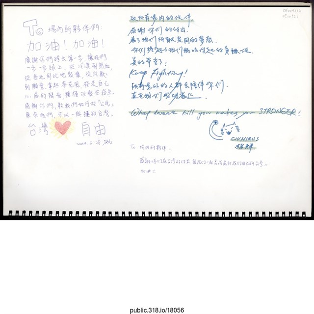 1.內容:你們堅持、純真、努力\r\n已經感動到在外場的每個人\r\n努力不會白費,血不會白流\r\n加油!辛苦你們了!!\r\n支持你們到底!台灣加油!!\r\nFighting\r\n台灣加油!\r\n六、七年級生全力支持!退回服貿\r\nTo場內的夥伴們:\r\n加油!加油!\r\n感謝你們跨出第一步,讓我們一步一步跟上,\r\n從冷漠到熱血,\r\n從各地到此地聚集,從沉默到願意拿起麥克風,發表自己心底的聲音,\r\n種種改變在發生。\r\n感謝你們,教我們如何做「公民」\r\n原來我們可以一起拯救台灣。\r\n台灣自由\r\n致所有場內的伙伴,\r\n感謝你們的付出,\r\n為了我們所有人共同的夢想,\r\n你們擔起了我們無法負起的責任\r\n真的辛苦了!\r\nKeep Fighting!\r\n所有場外的人都會陪伴你們\r\n直至我們成功為止\r\nWhat doesn't kill you makes you STRONGER!\r\nTo場內的夥伴:\r\n感謝你們為台灣的付出,讓我們一起完成屬於我們自己的台灣!!加油!!2.中研院原件典藏編碼:OE009233.中研院識別號:180564.中研院關係藏品-關聯:5.中研院關係藏品-整體:6.提供者:高格孚