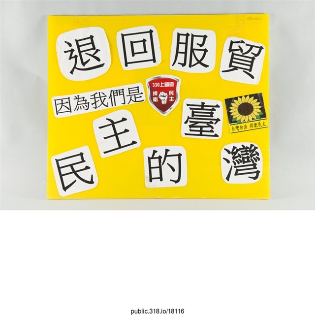 1.內容:退回服貿 因為我們是 民主的臺灣\r\n我們不孤單 我是臺灣人2.中研院原件典藏編碼:OE006623.中研院識別號:181164.中研院關係藏品-關聯:5.中研院關係藏品-整體:6.提供者: