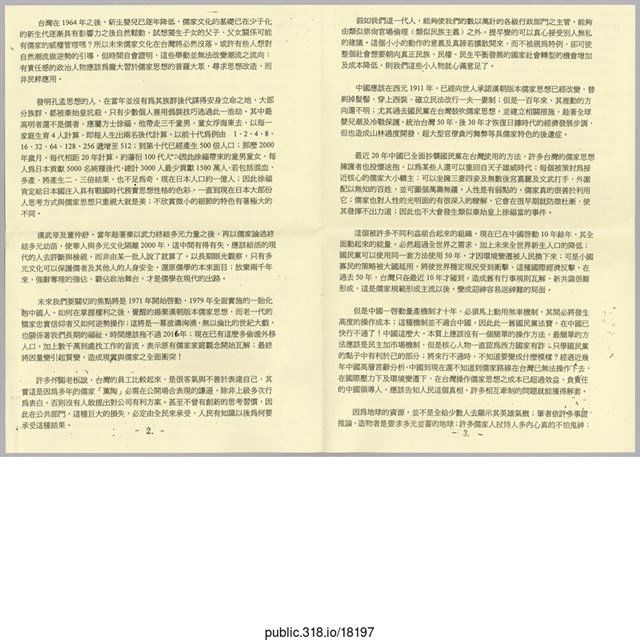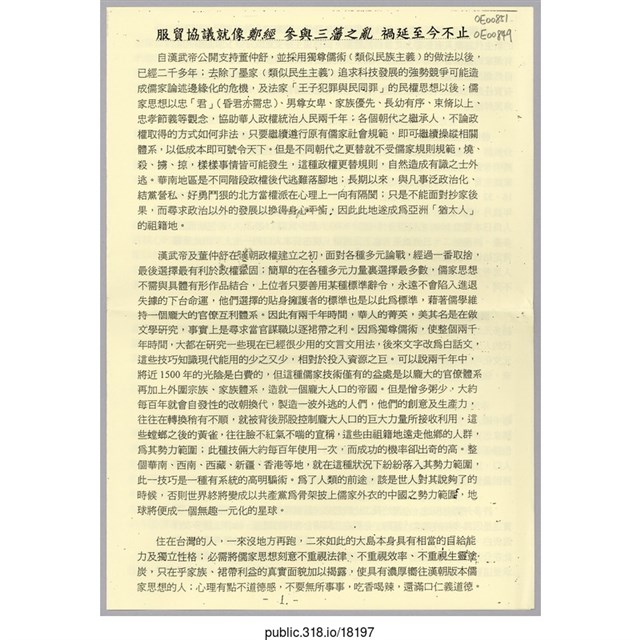 1.內容:服貿協議就像鄭經參與三藩之亂禍延至今\r\n自漢武帝公開支持董仲舒,並採用獨尊儒術(類似主義)的做法以後,已經二千多年,去除了墨家(類似民生主義)追求科技發展的強勢競爭可能造成儒家論述邊緣化的危機,及法家『王子犯罪與庶民同罪』的民權思想以後;儒家思想以忠『君』(昏君亦需忠)、男尊女卑、家族優先、長幼有序、束脩以上、忠孝節義等觀念,協助華人政權統治人民兩千年;各個朝代之繼承人,不論政權取得的方式如何非法〝只要繼續遵行原有儒家社會規範,即可繼續操縱相關體系,以低成本即可號令天下。但是不同朝代之更替就不受儒家規則規範,燒、殺、擄、掠,樣樣事情皆可發生,這種政權更替規則,自然造成有識之士外逃。華南地區是不同階段政權後代逃難落腳地;長期以來,與凡事泛政治化、給黨營私、好勇鬥狠的北方當權派在心理上一向有隔閡;只是不能面對抄家後果,而尋求政治以外的發展以換得身心平衡,因卜此此地遂成為亞洲『猶太人』的祖籍地。\r\n漢武帝及董仲舒在漢朝政權建立之初,面對各種多元論戰,經過一番取捨,最後選擇最有利於政權鞏固;簡單的在各種多元力量裏選擇最多數,儒家思想不需與具體有形作品結合,上位者只要善用某種標準辭令,永遠不會陷入進退失據的下台命運,他們選擇的貼身擁護者的標準也是以此為標準,藉著儒學維持一個龐大的官僚互利體系。因此有兩千年時間,華人的菁英,美其名是在做文學研究,事實上是尋求當官謀職以逐裙帶之利。因為獨尊儒術,使整個兩千年時間,大都在研究一些現在已經很少用的文言文用法,後來文字改為白話文,這些技巧知識現代能用的少之又少,相對投入資源之巨。可以說兩千年中,將近1500年的光陰是白費的,但這種儒家技術僅有的益處是以龐大的官僚體系再加上外圍宗族、家族體系,造就一個龐大人口的帝國。但是憎多粥少,大約每百年就會自發性的改朝換代,製造一波外逃的人們,他們的創意及生產力,往往在轉換稍有不順〝就被背後那股控制龐大人口的巨大力量所接收利用,這些螳螂之後的黃雀,往往臉不紅氣不喘的宣稱,這些由祖藉地遠走的人群,為其勢力範圍;此種技術大約每百年使用一次,而成功的機率卻出奇的高。整個華南、西南、西藏、新彊、香港等地,就在這種情況下紛紛落入其勢力範圍,此一技巧是一種有系統的高明騙術。為了人類的前途,該是世人對其說夠了的時候,否則世界終將變成以共產黨為骨架披上儒家外衣的中國勢力範圍,地球將便成一個無趣一元化的星球。\r\n住在台灣的人,一來沒地方再跑,二來如此的大島本身具有相當的自給能力及獨立性格;必需將儒家思想刻意不重視法律、不重視效率、不重視生靈塗炭,只在乎家族、裙帶利益的真實面貌加人揭露,使具有濃厚嚮往漢朝版本儒家思想的人;心理有點不道德,不要無所事事,吃香喝辣,還滿口仁義道德。-1.-\r\n台灣在1964年之後,新生兒已逐年降低,儒家文化的基礎已在少子化的新生代逐漸具有影響力之後自然鬆動,試想獨生子女的父子、父女關係可能有儒家的威權管理嗎?所以未來儒家文化在台灣將必然沒落。或許有些人想對自然潮流攸逆勢的引導,但時間自會證明,這些舉動並無法改變潮流之流向;有責任感的政治人物應該為龐大習於儒家思想的普羅大眾〝尋求思想改造,而非民粹應用。\r\n發明孔孟思想的人,在當年並沒有為其族群後代謀得安身立命之地,大部分族群,都被秦始皇坑殺,只有少數幾個人善用偽裝技巧逃過此一浩劫,其中最高明者還不是儒者,應屬方士徐福,他帶走三千童男、童女浮海東去,以每一家庭生育4人計算,即每人生出兩名後代計算,以前十仳為例由1、2、4、8、16、32、64、128、256遞增至512;到第十代已產生500倍人口;那麼2000年歲月,每代相距20年計算,約藩衍100代人,因此徐福帶來的童男童女,每人為日本貢獻5000名純程後代,總計3000人最少貢獻1500萬人,若包括混血、多產,將產生二、三倍效果,也不足為奇,現在日本人口約一億人,一直到現在日本大部分份人思考方式與儒家思想只重視數大就是美;不欣賞微小的細節的特色有著極大的不同。\r\n漢武帝及董仲舒,當年趁著秦以武力終結多元力量之後,再以儒家論述終結多元幼苗,使華人與多元民化隔離2000年,這中間有得有失,應該給活的現代的人去評斷與檢視,而非由某一批人說了算了。以長期眼光觀察,只有多元文化可以保護儒者及其他人的人身安全,還原儒學的本來面目;放棄兩千年來,強辭奪理的強佔、霸佔政治舞台,才是儒學在現代的出路。\r\n未來我們要關切的焦點將是1971年啟動,1979年全面實施的一胎化的中國人,如何在掌握權利之後,覺醒的揚棄漢朝版本儒家思想,而老一代的儒家忠實信仰者又如何逆勢操作;這將是一幕波濤洶湧,無以倫比的世紀大戲,也關係著我們長期的福祉。時間應該拖不過2016年;現在已有這麼多偷渡外移人口,加上數千萬到處找工作的盲流,表示原有儒家家庭觀念開始瓦解;最終將因量變引起質變,造成現實與儒家之仕面衝突!\r\n許多外國老板說,台灣的員工比較起來,是很客氣與不善於表達自己,其實這是因為多年的儒家『薰陶』必需在公開場合表現的謙遜,除非上級多次行為表白,否則沒有人敢提出對公司有利方案。甚至不曾有創新的思考習慣,因此在公共部門,這種巨大的損失,必定由全民來承受,人民有知